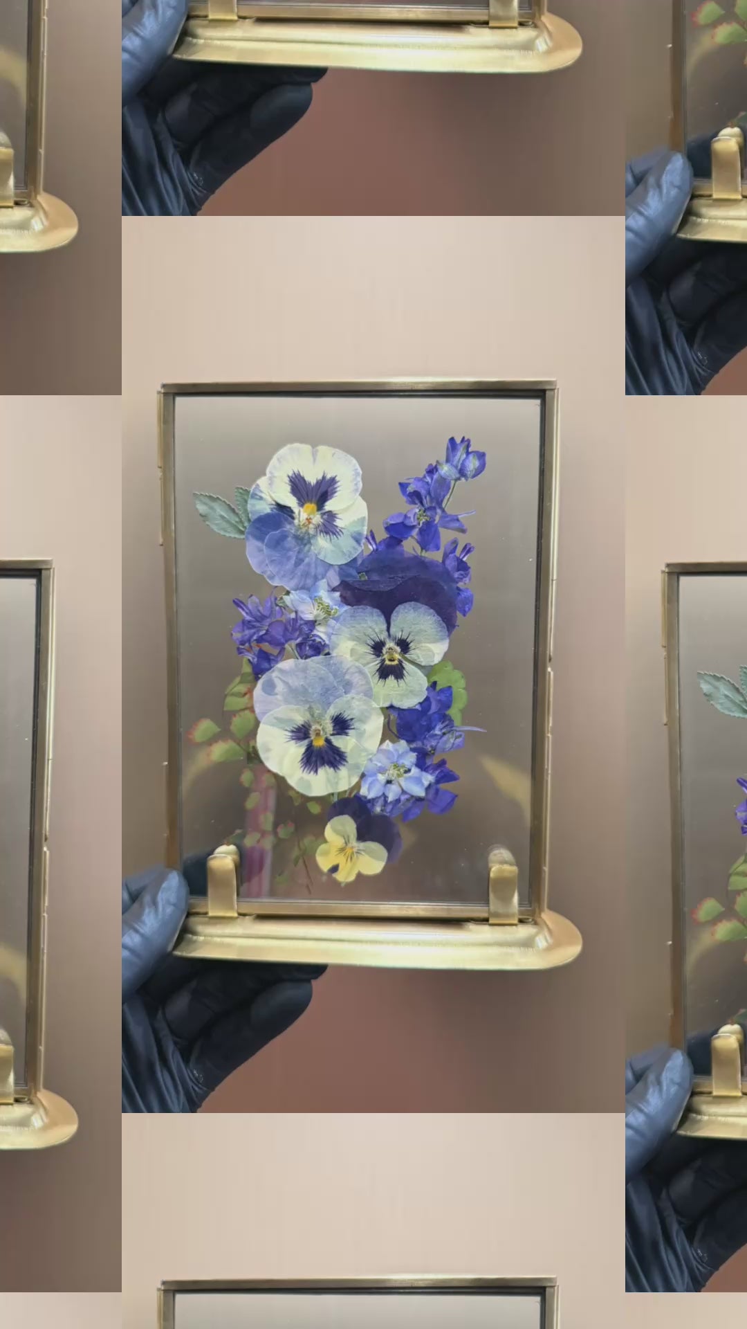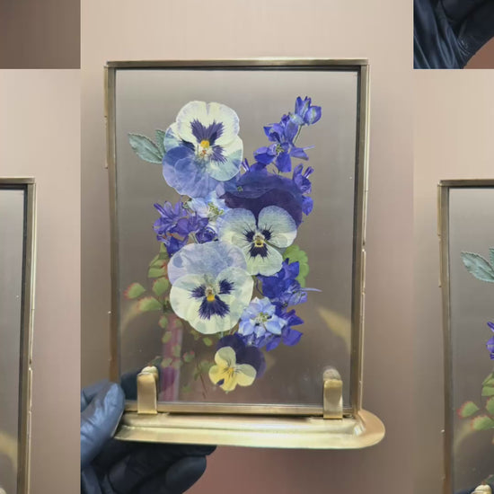 Blue petals in standing glass frame